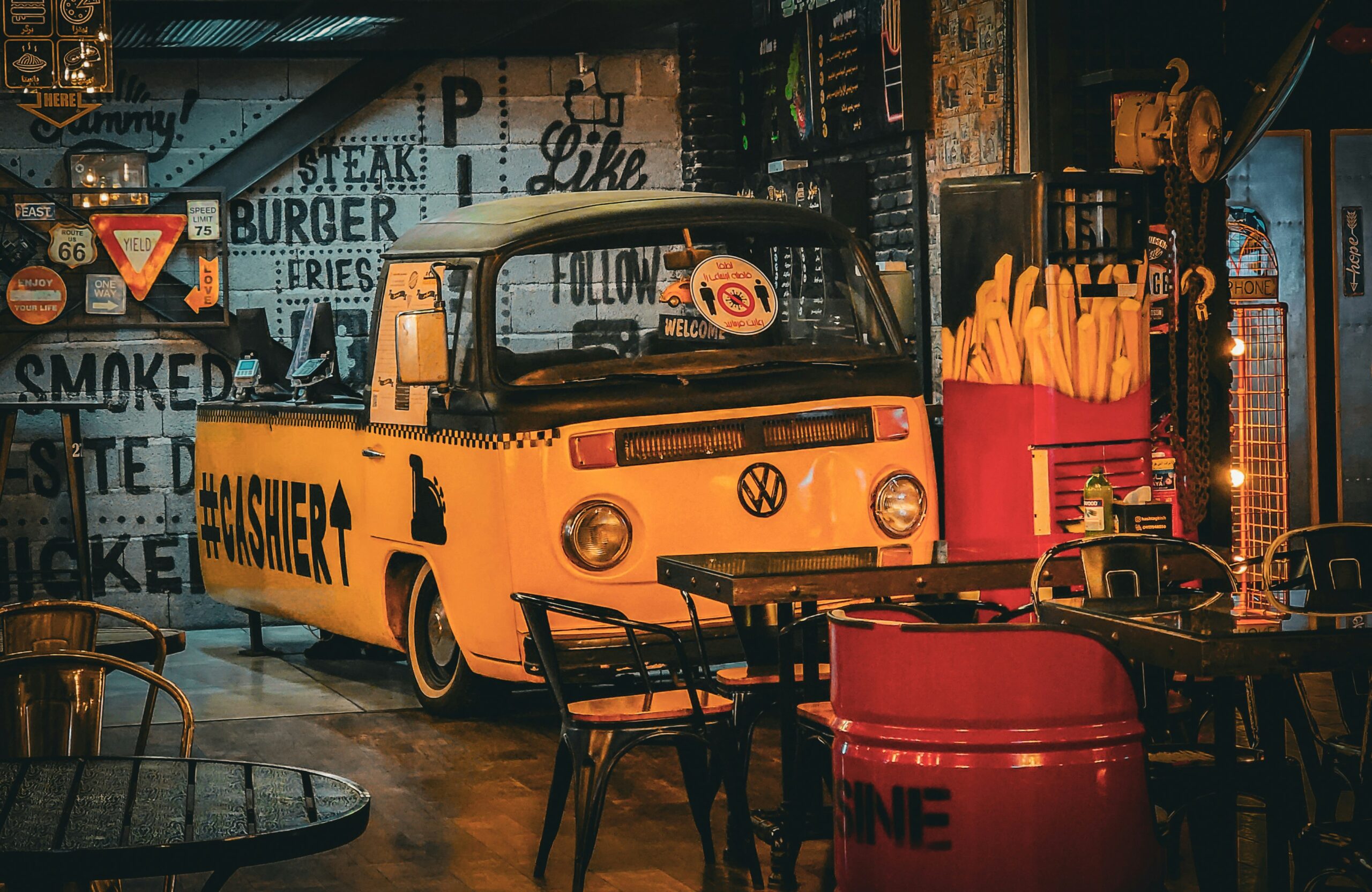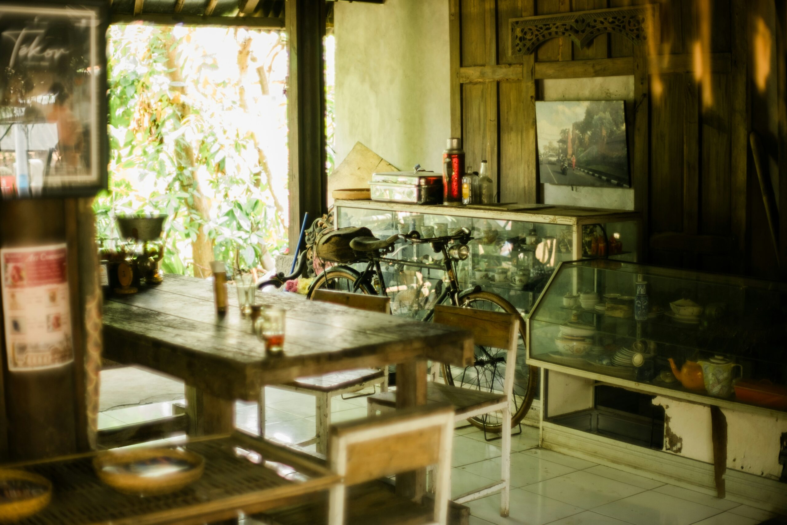 Konsep café dengan nuansa klasik retro, menggunakan furnitur antik dan dekorasi tembaga untuk suasana hangat dan nostalgia.